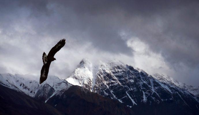 Golden Eagle Most people think of bald eagles when they think about Alaska, but Denali National Park and Preserve is better known for its golden eagles—especially north of the Alaska Range. With a wingspan of nearly six feet, visitors to the park can see them soaring high overhead, though if you’re lucky you may see one perched in a nearby tree. Golden eagles primarily stick to mountainous regions of the park where they hunt in areas with light vegetation and few trees. Their diet includes ground squirrels, marmots, and ptarmigan.