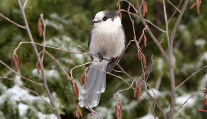 Gray Jay Gray jays like to hop about campsites where they look for handouts, as well as an opportunity to steal your food. Unlike jays in the “Lower 48” states, this particular jay has no crest. They store food by attaching it to trees with their saliva. More Wildlife in Denali National Park and Preserve For more about the wildlife in Denali National Park and Preserve, check out: