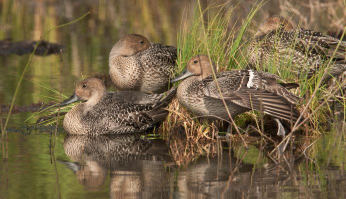 Northern Pintail Duck With its slender neck and long central tail feathers, the Northern Pintail strikes a distinctive silhouette. Both males and females have bills and legs that undulate from blue to gray, though the male is distinctive due to the white stripe from its head to its undercarriage.