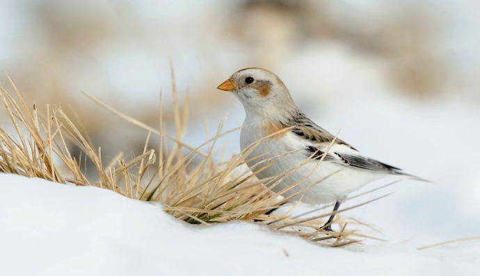 Snow Bunting A small songbird, the snow bunting is also known as a snowflake. They can be seen along the park’s roadside in March and April and are noted by their white plumage touched by gray and black along their wings. Their song tends to be a low warble that can include a rolling rattle and a buzzing sound.
