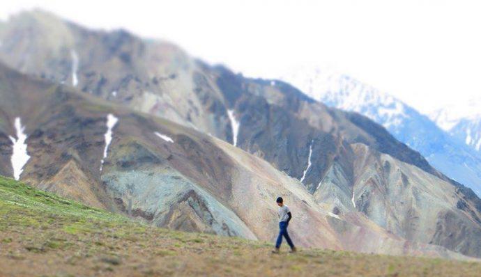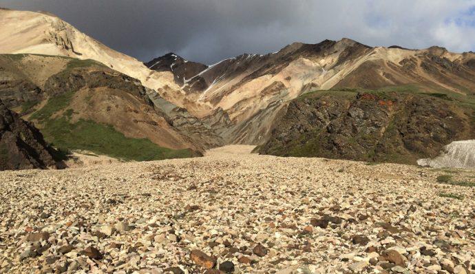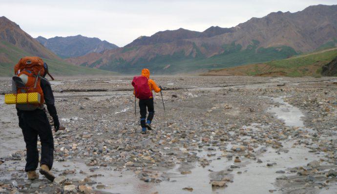 As we climbed the mountain pass the next day, the snow crunched beneath our boots and for a few moments, we were sheltered from the wind. I was aware of other things. The deep blue Alaska forget-me-nots were in full bloom. The roaring stream flowing under the snowfields was a glorious sound. But it made me uneasy. How far would we fall if the snow collapsed? On the ridge overlooking the Toklat River, the wind roared like a freight train. Walking was difficult with hiking poles. Our packs acted like sails taking us on the course of the wind’s choosing. We dropped our packs and scouted options for our descent. One stream valley was rocky and steep; the other muddy and less steep. Into the mud we sank. We were able to descend about two-thirds of the way off the ridge when the creek drainage became steeper. We made our way down 3-foot drops. And 4-foot drops. But 6 and 8-foot drops were not possible. We opted to move sideways along the side of the mountain, which is where this story began: Tate, Susan and I crouched on the side of a mountain, seeking shelter from the wind. Descending steep gravel fields (also called talus or scree) is tricky. It’s easy to slide down, but hard to control. Tate wanted to slide, but we had crossed above the cliffs and I was afraid his slide could become uncontrolled. I positioned myself below him while Susan hiked behind him. In the end, the solution was incredibly simple. He left his pack behind and was able to move more naturally without the additional weight for the wind to blow around (did I mention he is 6 foot 3 inches tall and 140 pounds?).