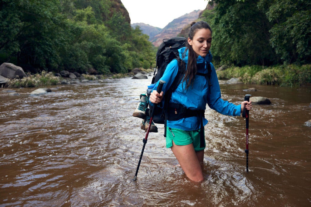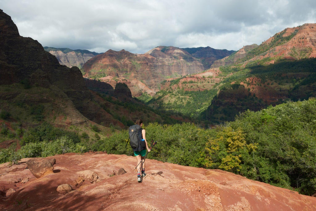 We’re about half way along the trail. Narrow and with lots of steps, the path winds its way downwards. When we’d parked the Jeep at the start of the trail, we were feeling excited and yet nervous at the same time. The two-day tour along the Kukui and the Koaie trails covers a distance of 12 miles and a cumulative elevation gain of over 900 m. The trails lead along the Waimea Rivera and through the canyon. First and foremost, this tour is a test of stamina. Neither going to the gym, nor regular running can prepare you properly for the unaccustomed strain of lugging a full backpack and the exertion of walking long distances over ungroomed terrain. But, it’s also a test of our equipment. We had spent many an evening at home thinking about what to take, spreading everything out all over our living room floor: a tent, cooking utensils, sleeping mats, camera equipment and backpacks. Also, GORE-TEX jackets and shoes to ensure that we would be well equipped for the multiple climates we were likely to encounter on the Hawaiian Islands.