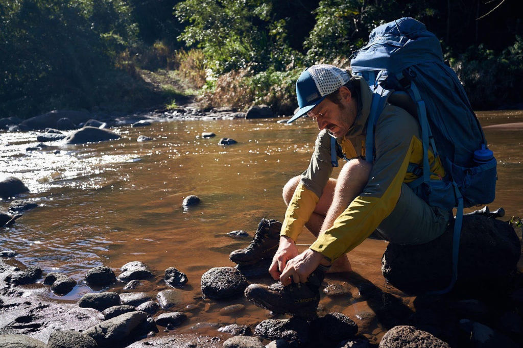 As she passes us, a hiker walking in the opposite direction warns us that after heavy rain the water level of the river at the bottom of the valley is higher than usual and possibly impassable. “Chocolate milk,” she adds, giving us a grin and telling us that she hadn’t even attempted to get to the other side of the river. Hipalau, our camp for the night, is the third of the four camps in the canyon and situated on the other side of the river. Shortly before reaching the valley floor, the trail crosses a wooded area. From one minute to the next the trail becomes wet and muddy. Suddenly, we find ourselves up to our ankles in thick, sinking mud that sucks at our boots. Thanks to our waterproof hiking boots], even after tackling this section of the path our feet are still dry.