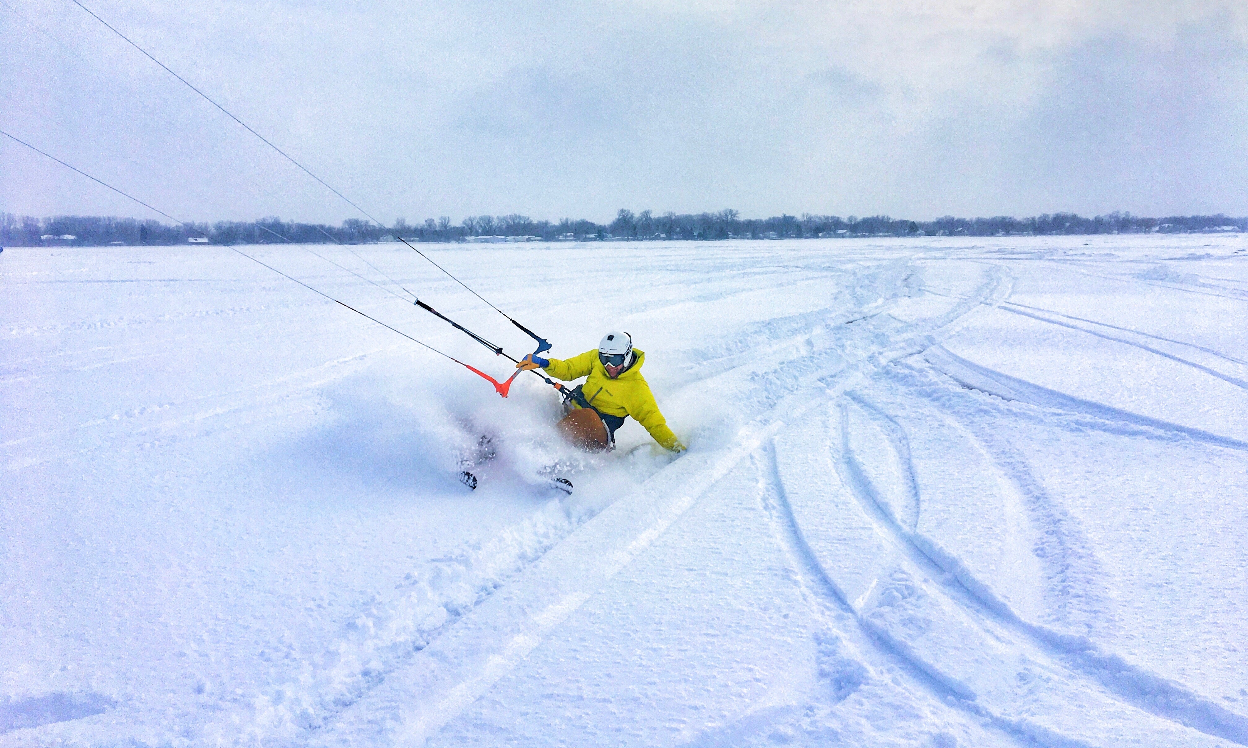 Das Coole am Snowkiting ist, dass man es in jedem Gelände machen kann. Es spielt wirklich keine Rolle. Alles, was du brauchst, ist die nötige Ausrüstung, Schnee oder Eis und ein bisschen Wind. Meine beste Lehrstunde hatte ich an dem einen Tag auf diesem riesigen zugefrorenen See in Wisconsin.