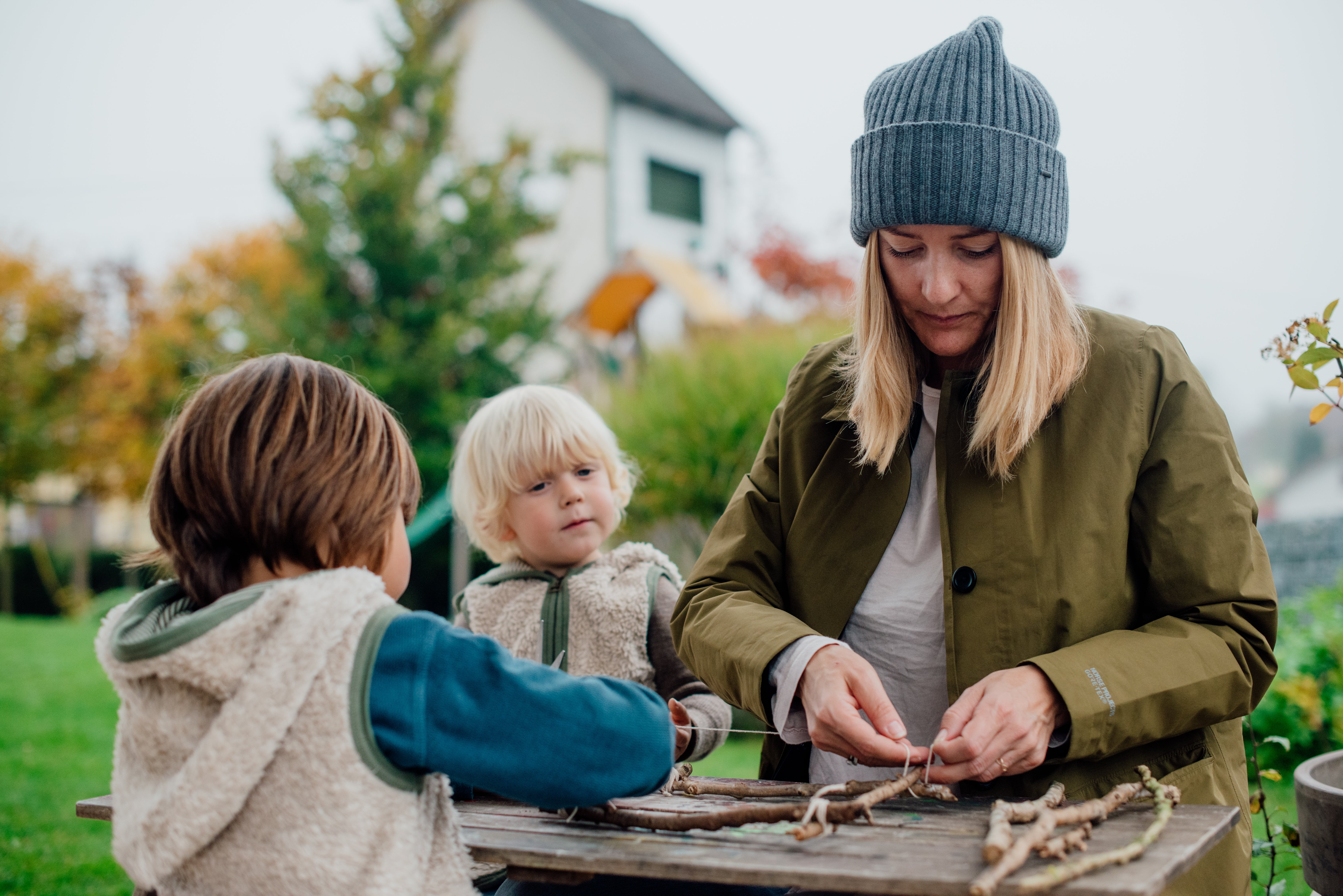 Und so kam es zu unserem gemeinsamen #TestedForLife Tryout: ein ganz normaler Tag im Familienleben von Sandy und Toni. Wir besuchten die Familie an ihrem Wohnort in der Nähe von Wels, Oberösterreich. Dort ist ihr Lieblingsplatz, in ihrem Haus, im Garten oder im nahegelegenen Wald. Frischluft ist ihnen besonders wichtig: Sandy und ihre Kinder sind täglich draußen in der Natur. So auch an diesem Tag. Maxi und Niklas sausten mit ihren Rädern voraus zum Wald. Dort sammelte die ganze Familie Stöcke, um daraus später daheim im Garten einen Bilderrahmen zu basteln.