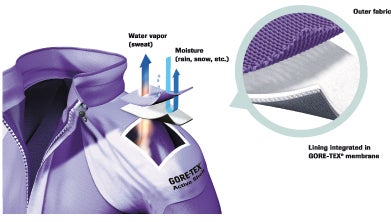 Möglich machen dies die neu entwickelten GORE-TEX Active Shell Laminate. Sie verbinden eine leichtere, dünnere GORE-TEX Membrane mit feinfasrigen Hochleistungstextilien, um dem aktiven Endverbraucher die ultimative 3-Lagen Lösung zu bieten. Auf der Futterseite wird durch eine völlig neuartige, bisher einzigartige Laminationstechnologie die textile Abseite jetzt erstmals direkt in die GORE-TEX Membrane integriert und sorgt damit für extreme Atmungsaktivität (RET<3) und hervorragenden Next-To-Skin-Komfort. Der Schweiß wird sehr schnell von der Haut weg und als Wasserdampf durch das Textil nach außen abgeleitet. Feuchtigkeit wie Regen oder Schnee und Wind bleiben aber außen vor. Dieses hohe Feuchtigkeitsmanagement sorgt für ein stabiles Körperklima und damit für eine bessere sportliche Leistungsfähigkeit.