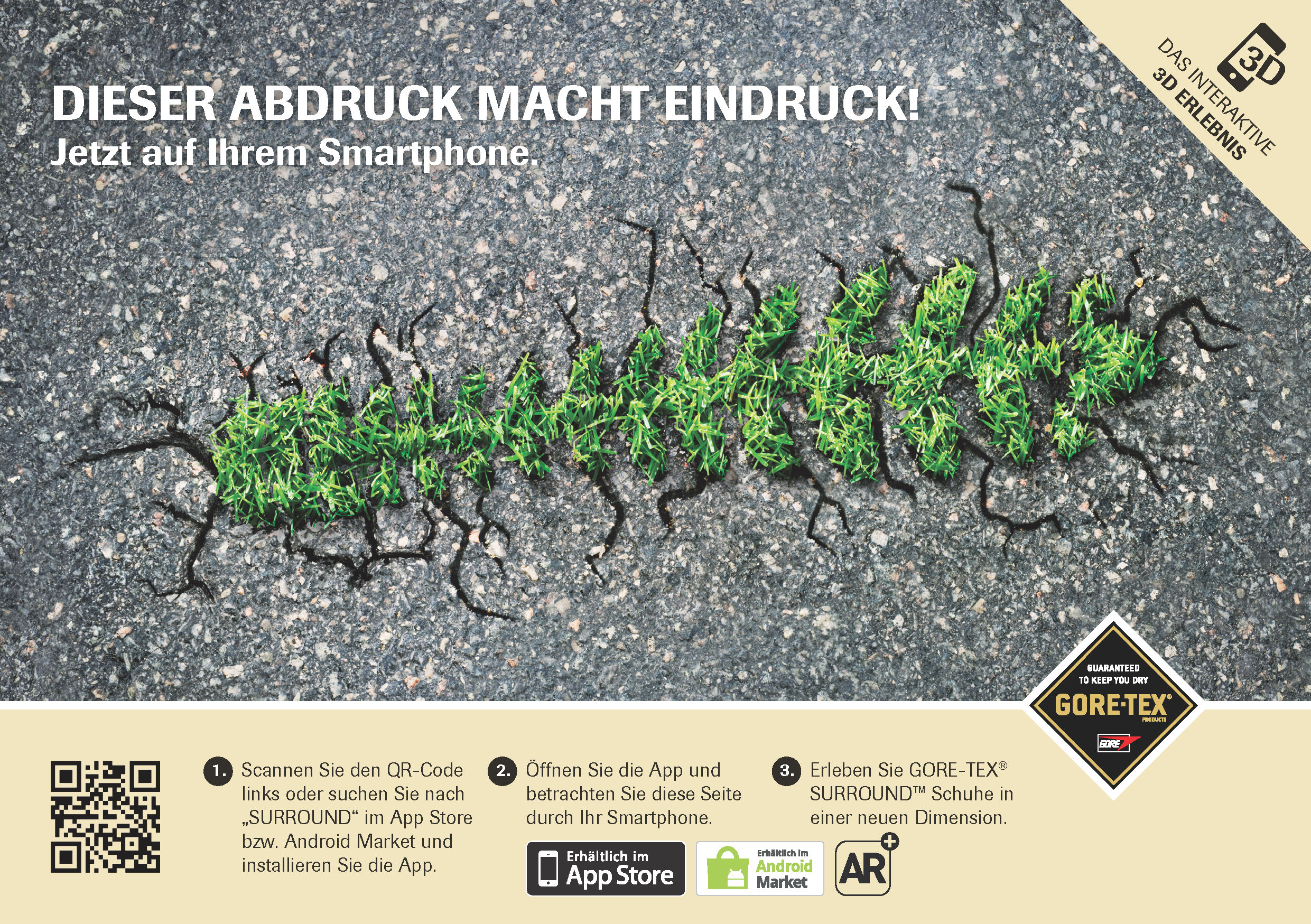 Mit Hilfe von „Augmented Reality" (erweiterte Realität) können Konsumenten die neue SURROUND™ Produkttechnologie in 3D unmittelbar auf Ihrem Smartphone erleben.Zutritt zu diesem besonderen Erlebnis gewährt eine Anzeige auf der Rückseite eines mehrseitigen Beilegers mit den aktuellen GORE-TEX SURROUND™ Sommerschuhen. Die Anzeige dient als sogenannter "Marker" für die kostenlose SURROUND™ App, die man sich zuvor auf seinem Smartphone installiert haben muss. Diese ist im App Store von Apple und Android Market (Google Play Market) verfügbar. Der Beileger selbst erscheint in einer Auflage von über 7 Millionen in Tageszeitungen und Magazinen wie Süddeutsche Zeitung, FAS, Der Standard, NZZ, Brigitte, Eltern, Stern und Spiegel.