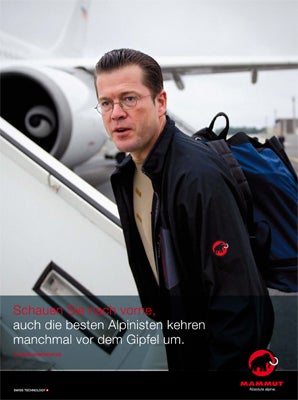 Mammut greift die Affäre um den Deutschen Verteidigungsminister Karl-Theodor zu Guttenberg mit einem Augenzwinkern auf.Unter dem Motto „Schauen Sie nach vorne, auch die besten Alpinisten kehren manchmal vor dem Gipfel um“ publiziert der Outdoorausrüster ein Bild des ehemaligen Verteidigungsministers während einer seiner Auslandsreisen, bei der er eine Jacke von Mammut trägt.