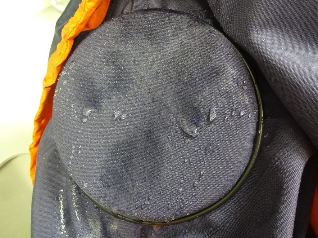 Within seconds it’s possible to say whether the water repellent finish is still fully functional. This is a good indication of how well the jacket has been cared for and maintained. The less the garment has been cared for, the faster it will wear out: microscopic particles of dirt can make their way more easily into the fabric, causing mechanical damage to the laminate and even to the membrane itself. A good water repellent finish therefore not only has a positive influence on functionality, but also ensures that the jacket’s useful life time is longer.Spray test