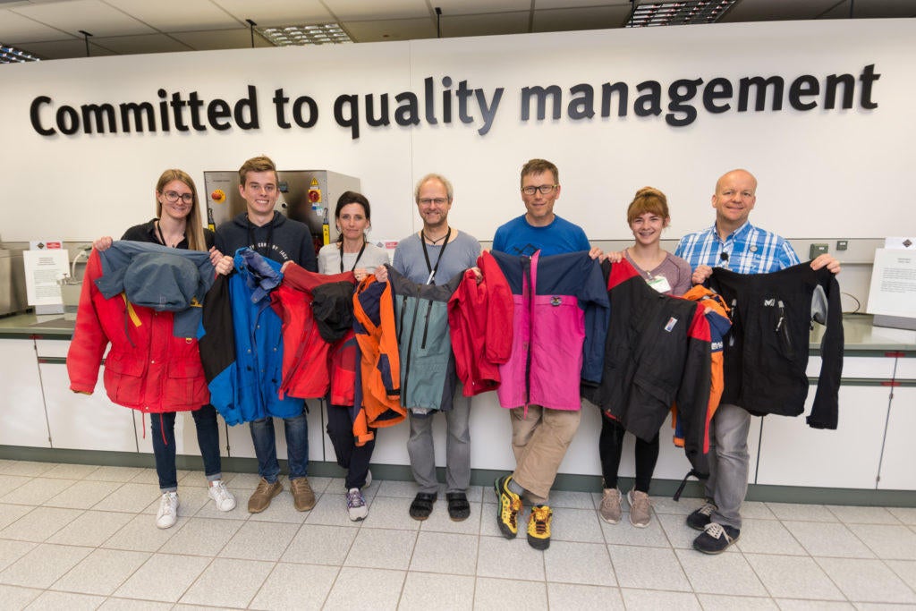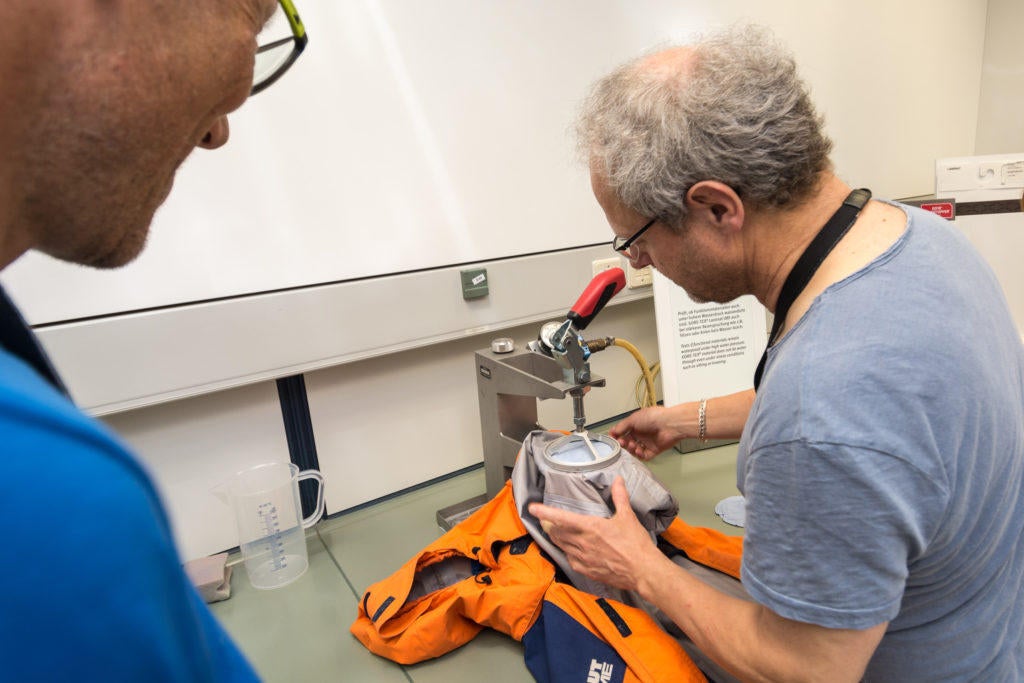 “The spray test can more precisely determine the quality of the water repellent finish by establishing how well the water rolls off the outer shell fabric. We use the Suter test when we suspect that a jacket might be leaking in places. At the high pressures used in the test we can quickly see whether and where water is able to penetrate the fabric,” Stefan says.