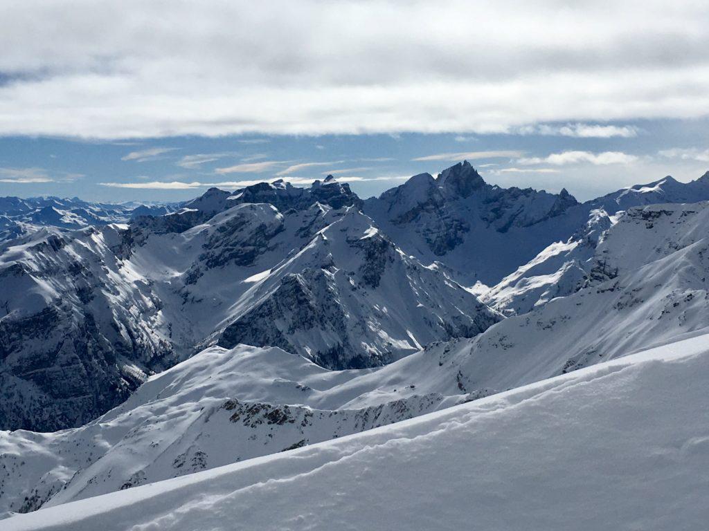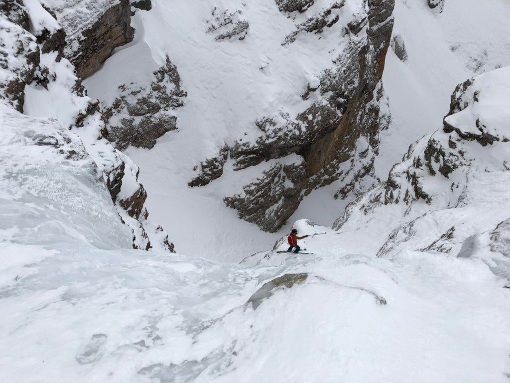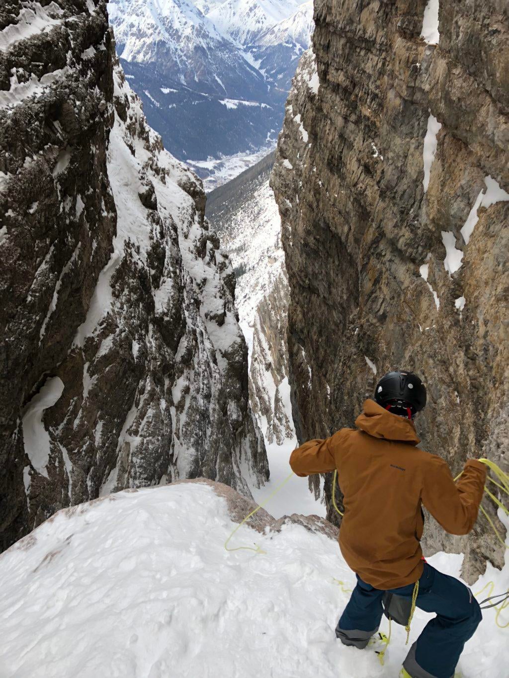 Although we had known the “hard facts” all along, the first turn of the north facing descent was still intimidating. We were all much quieter and more concentrated than we had been on the summit and during the ascent. Because the whole thing was my idea, I was given the dubious honour of making the first turns and finding the abseil sections. The snow was firm and grippy for the full length of the couloir, there was no ice, the hooks were all still in place in the abseil sections and the landscape, the insane views down the gully all the way to the valley floor, unbeatable. That Dolomites feeling right on my doorstep! Skiing down towards the valley between steep rock walls towering above you is an awesome experience and certainly not to be compared with that “normal” freeride feel. Still, in such steep and narrow couloirs, it's better if you don't fall.