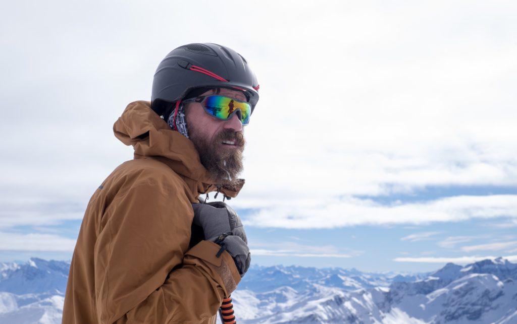 The exertion of the 1,200 m ascent from the Ochsenalm to the summit meant that we were all feeling rather hot and sweaty. But that was about to change. Not only was a biting wind blowing straight at our GORE-TEX jackets], we were also inwardly shuddering at the daunting prospect of skiing down the couloir that we had just caught sight of. Ahead of us lay a 1,700 m descent, maximum degrees of steepness exceeding 40°, two definite, and one possible, abseil sections and a final run through steep pine forests.