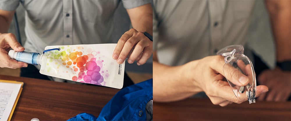 ゴーグルも実は被災地では欠かせないアイテム(下の写真:右)。「被災地に行って分かるのが、粉塵がすごいということ。ゴーグルは欠かせないアイテムになっています」