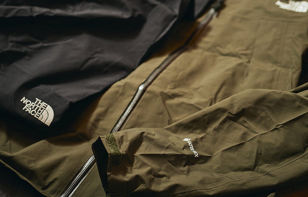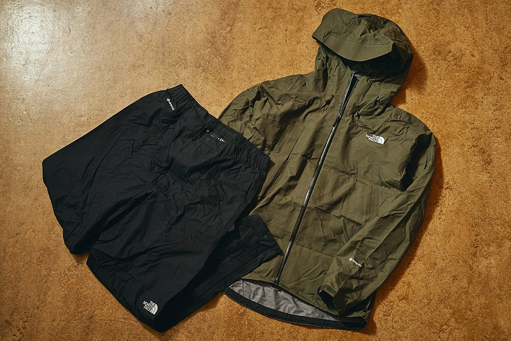 雨風をしのぐことができるレインウェアは登山者のマストアイテムとして知られますが、雨が降っていなくとも、夜露で濡れた藪を歩くとき、そして万が一遭難したときの保温のためなど、実は必要となるシーンは多いのです。写真はGORE-TEXファブリクスを採用した、ザ・ノース・フェイスのクライムライトジャケットとジップパンツ。コンパクトに収納することができる。