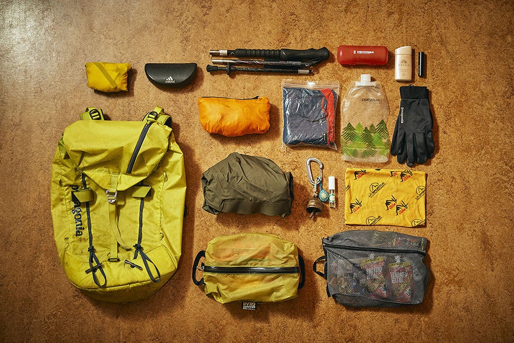どんなことも自分の責任となる登山。それは決して大胆なチャレンジを意味するのではなく、誰にでもマネできる小さな一歩の積み重ね。例えばそれは、パッキングの技ひとつにも現れています。こちら(下の写真)は花谷さんがいつも持ち歩いている代表的なアイテム。とてもコンパクトにまとめられています。軽量かつコンパクトさが重要となるトレイルランナーのパッキングを参考にすることもあるのだとか。