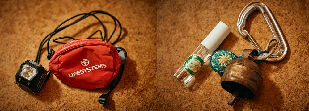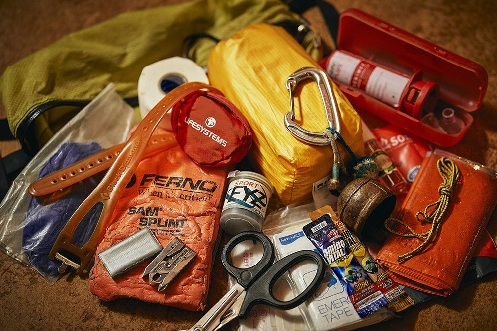 そのように教えてくれる花谷さんの、いつも持ち歩いているエマージェンシーキット一式を見せてもらいました。どれも、長い登山やガイド経験の中で厳選されてきたアイテムばかりです。