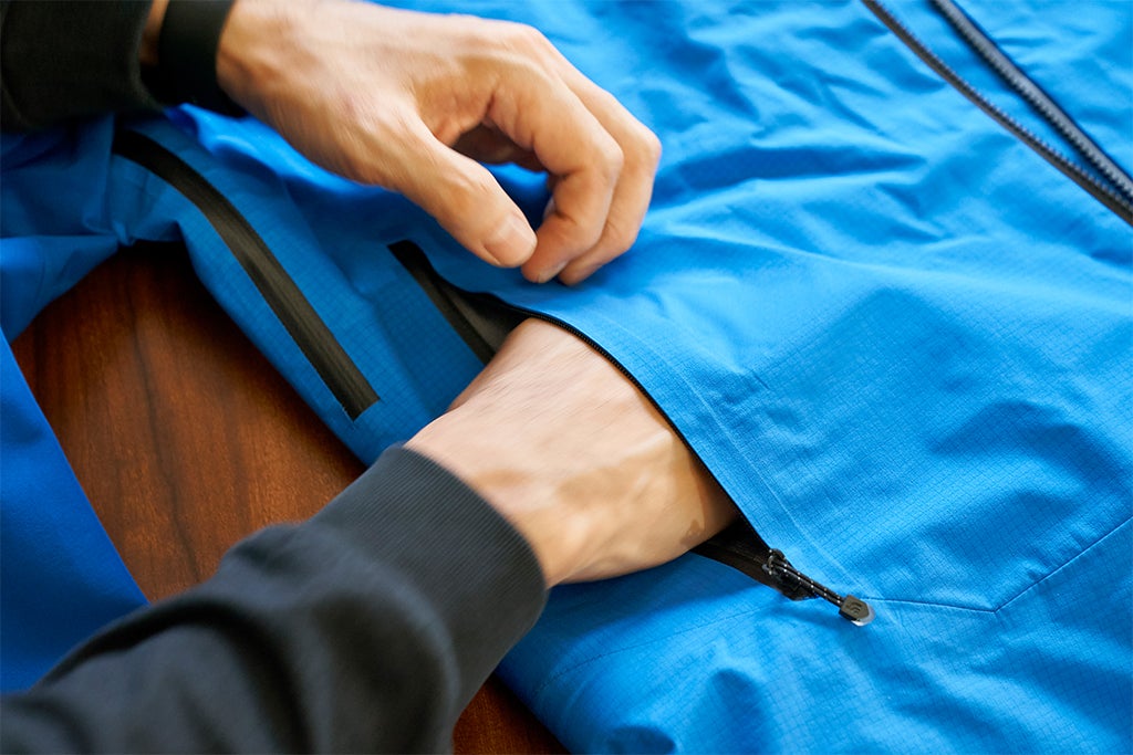 「今回、あえて街向けのジャケットと同じような(脇腹あたりの)位置にポケットをレイアウトしました。通常、山での過酷な状況のみに照準を合わせて作り込むとどこまでもシンプルにせざるを得ず、ハーネスなどと干渉してしまうのでレイアウトを避ける位置なのですが、幅広いシーンで使う中では物足りない場面が出てきてしまいます。実際にハーネスを着用するシーンは限られているので、より快適に使っていただくためにはどうつくるべきかを考慮しました」