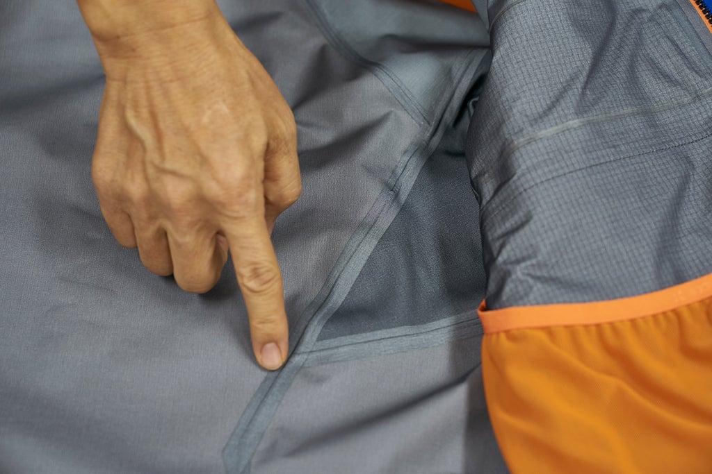 ストレッチ生地は40デニールで、ジャケットの肩甲骨の横から腕にかけてのパネル部分に使用。裏地を見ると一目瞭然ですが、生地の切り替え部分には8mmと12mmのシームテープを使い分け、生地の厚みの違いによる強度差にも配慮しながら、極限まで頑丈さと軽さのバランスを図っています。