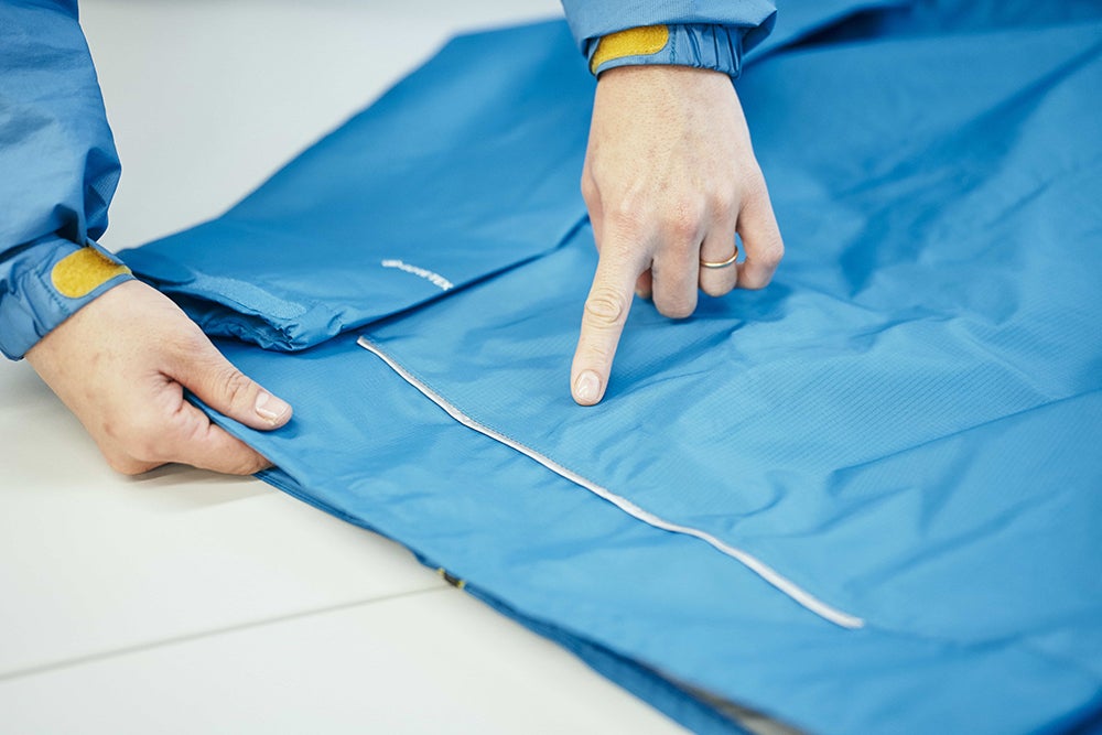 「レインダンサーはウィンドブレーカー感覚で手軽に着られて雨もしっかり防げる、一着持っておくと心強いレインウェアです。大人サイズも展開しているモンベルの定番アイテムなのですが、キッズサイズのものには背中にリフレクター素材を搭載したり、パンツの裾に丈調節ができてバタつき防止にもなるゴムひもを設けたりなど、工夫を施しています。モンベルではスタッフの意見を取り入れながら製品開発をしているのですが、こういったディテールには子供のいるスタッフの意見が反映されています」(土井さん)