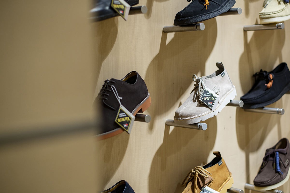 「以前は、いわゆるビジネス・ドレスシューズの基本形とも言えるストレートチップがよく売れる傾向にあったのですが、昨今はバシっとスーツを着て仕事をする人が昔と比べても少なくなっていることもあり、外羽根のプレーントゥ、Uチップ、ローファー、あとは秋冬だとサイドゴアブーツといった、少しカジュアル寄りの革靴がよく売れています。カジュアルシューズではレザーシューズならクラークス、カンペール、エコーといったところが人気です。少し前まで続いていたスニーカートレンドや、革靴への“硬い”とか“重い”とか“痛い”というイメージから、スニーカーを選ぶ人が増えていたのですが、それでも革靴を履きたいという方にとっては、クラークスのシューズなどはちょうどその中間に位置するアイテムとして取り入れやすいのだと思います」(宮下さん)