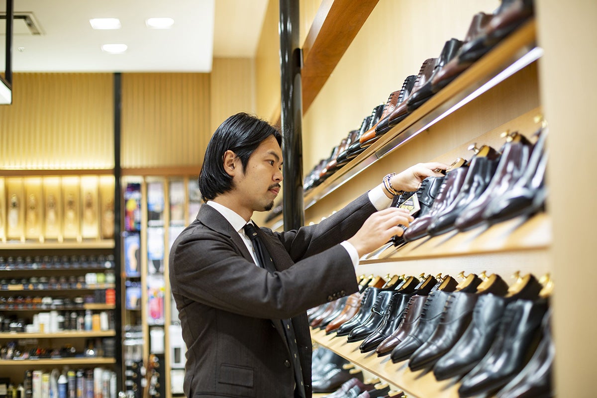 「革靴における昨今の風潮は、常にコンフォートなものが求められているように感じます。コロナ禍を経て家から出る必要性が減った方や、外出時にもスーツを着ない方が増えたこともあり、革靴においてもスニーカーのように履けるものや、履き心地がいいもの、水に強いなどの機能性を持ったものが好まれるようになってきました。生活様式の変化に合わせて、お客さまのシューズに対する需要も変わってきているように思います」(谷口さん)