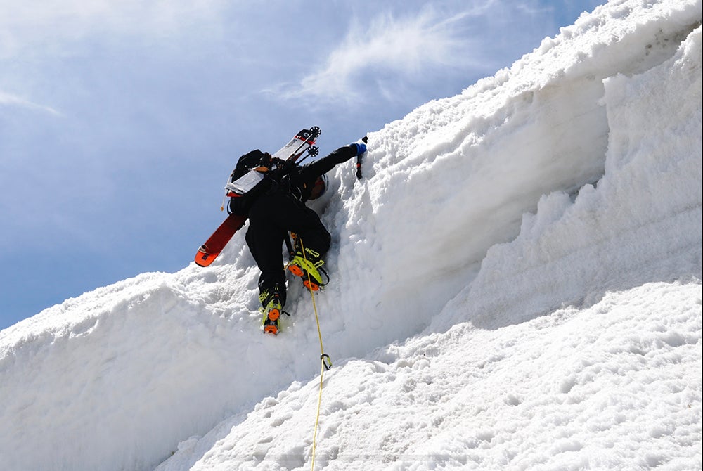 「僕は自然地形を滑ったり登ったりするのが好きなので、山の地形図や山肌を見て、どのラインを登り、どのラインを滑るのかを考えて、実際に山に入るルーティンを冬はほぼ毎週繰り返しています。使うギアは実際に使ってみたり、人に聞いたりしながら選んでいます。今使っているウェアはパタゴニアの『パウスレイヤー・ジャケット/ビブ』で、強度の高いGORE-TEX PRO ファブリクスを使っているので、クライミング時の岩への耐久性や、防風性など、あらゆる面で一番優れていると思います。また、環境や作り手に配慮している点もアイテムを選ぶポイントになっています。春から秋のクライミングでは、スカルパのシューズ『メスカリート ミッド』を愛用していますが、これもGORE-TEXなのでムレにくく、快適に様々なシーンで使える一足です。GORE-TEX製品は長く使える点もありがたいですね」