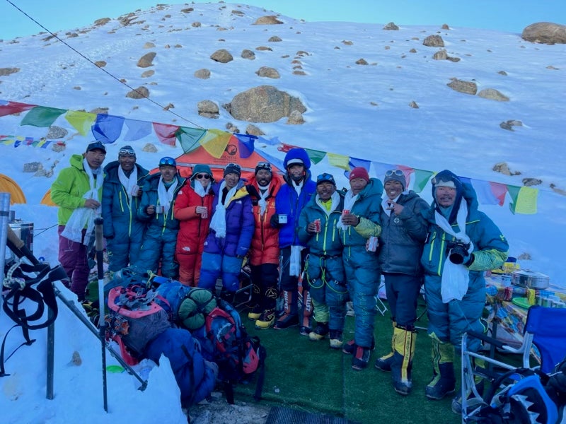 シシャパンマに登頂し、ベースキャンプに戻ってきたときの写真。シェルパたちとともに。