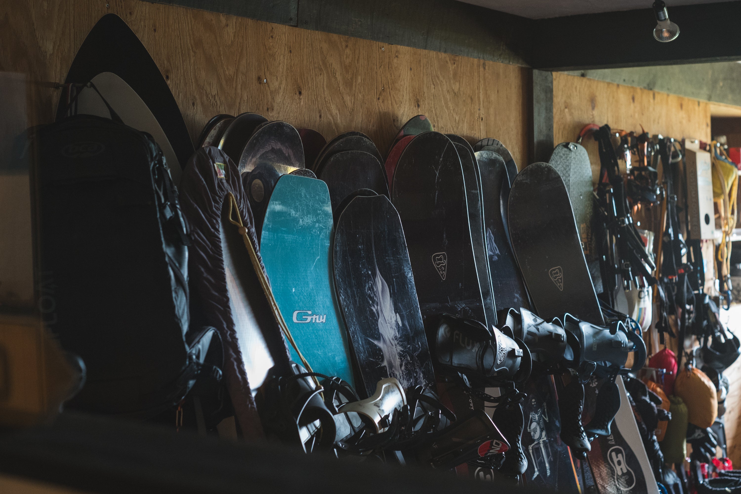 自宅の道具部屋に所狭しと並ぶ、歴代のスノーボード。