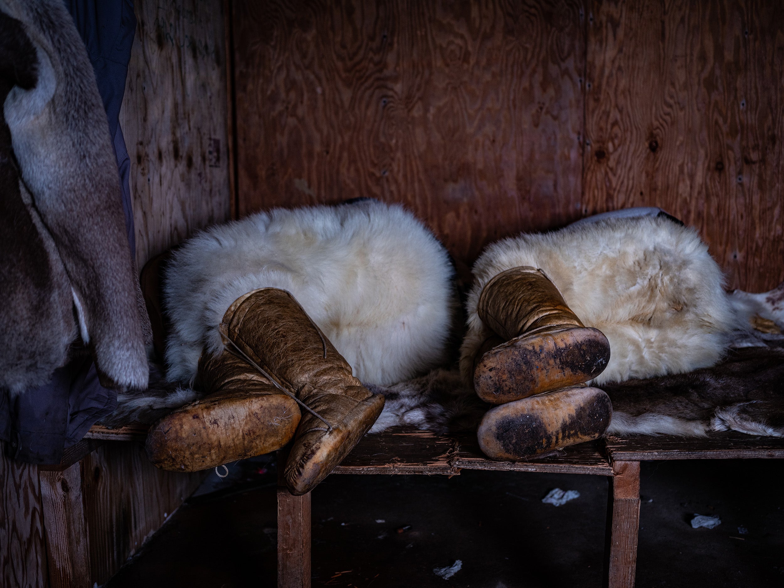 伝統的なブーツ「カミック」と、シロクマの毛皮で作られたナノ(モンペ)。イヌイットにとって、北極動物の頂点にいるシロクマの肉を食べたり、毛皮を纏ったりすることは狩猟民としてのスピリットを強くすると言い伝えられている。