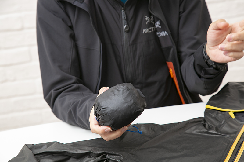 それにより、重さは約120gで、こぶし大のサイズ(パッキング時)を実現。いわゆる防風シェルと比べても、目を見張るスペックを誇ります。