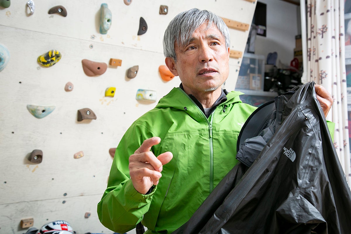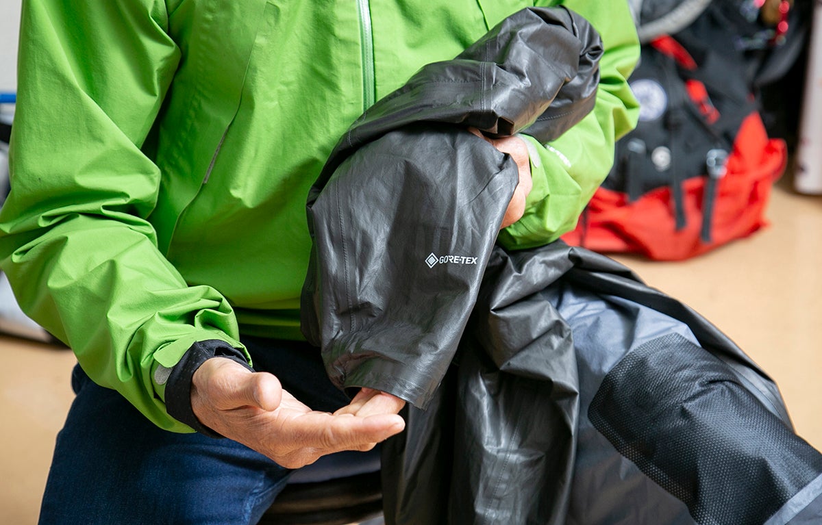 「雨に対してとても強いというのが、選んだ最大の理由です。50年近くアウトドア業界に携わってきて、今までいろいろなウェアを着てきましたが、この生地の撥水性の高さにはちょっと未来を感じたくらいです。これを着たままスタジオで汗をかいて、そのままシャワールームで水を浴びるというテストを個人的に行ってみたのですが、内側は汗で結露することもあまりなく、そして表地から浸水することはありませんでした」