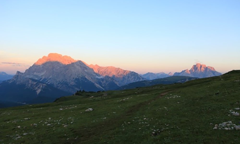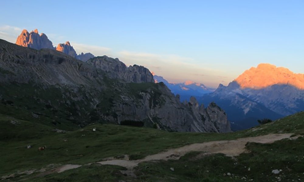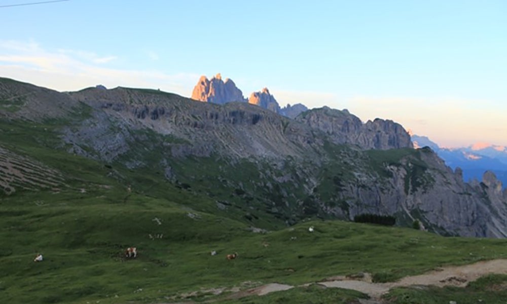 산장 밖으로 나오니 그 사이 크리스탈로 산은 더 붉어졌고 트리치메를 마주하고 있는 돌로미티 최고의 침봉인 칸디니 디 미주리나 (Cadini di Misurina) 산군 또한 멋진 자태를 뽐내고 있었다. 마치 설악산의 용아장성 같은 느낌이 드는 칸디니 디 미주리나 (Cadini di Misurina) 산군은 뾰족한 침봉 군락지다. 주차장 캠핑카 에서 밤을 보낸 캠퍼들, 산장 사람들, 자전거를 타고 지금 막 아우론조에 도착한 사람들까지 새벽 산책을 나선 이들이 하나 둘 모여든다. 나도 빠질 수없지. 알프스 초원의 소들이 목에 달린 방울 소리를 내며 아침을 먹고 있는 곳을 피해 빠르지도 느리지도 않은 걸음으로 돌로미티의 새벽을 즐긴다.