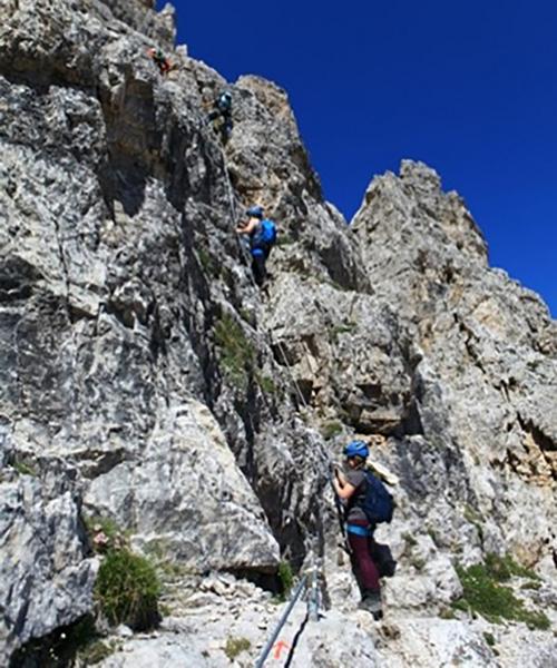 (위), (아래) 비아 페라타를 즐기는 사람들, 비아 페라타 장비를 착용해야 한다.