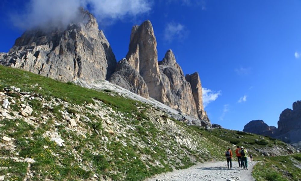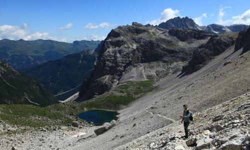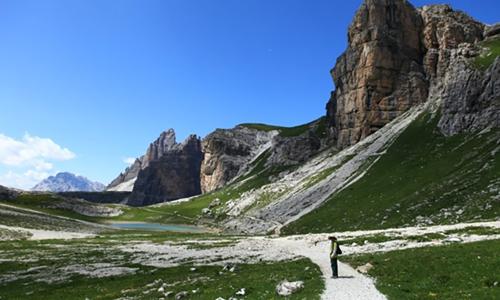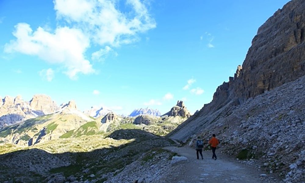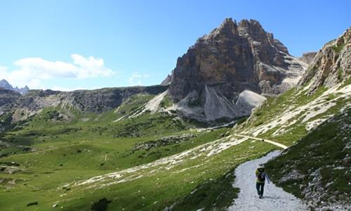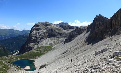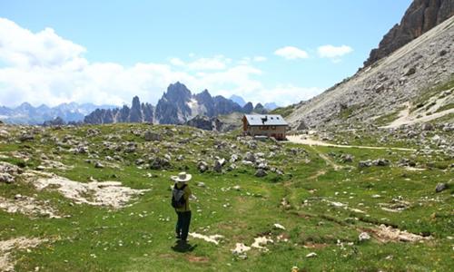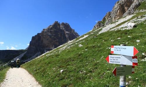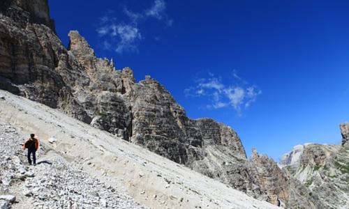 이탈리아 북동부 알프스 산맥 돌로미티는 3,000m급 봉우리 18개와 12개의 빙하를 품고 있다. 돌로미티의 대표적인 트레킹 루트는 알타비아 1,2코스가 있는데 각 코스를 다 걸으려면 10일 이상씩 걸린다. 보통 아우론조 산장을 시작으로 하는 트레킹은 101,104,105 트레일을 걷는 루트다. 우리는 라바레도 산장을 뒤로 하고 104 트레일이 시작되는 곳에서 파테르노 산(Monte Paterno)의 안부인 포르첼라 라바레도(Forcella Lavaredo) 고개로 간다.