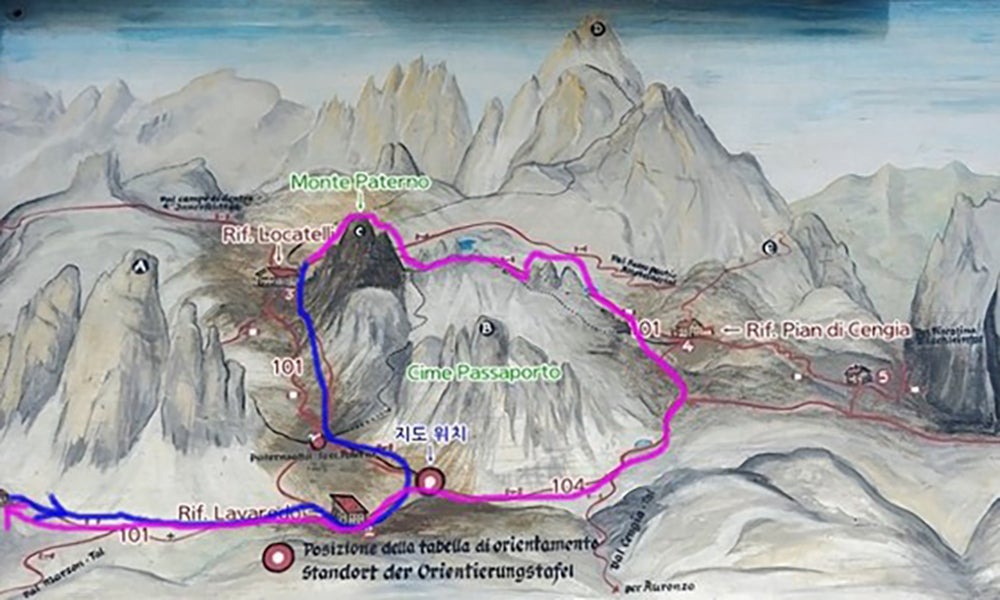 로칼텔리 산장(Rifugio A.Locatell) → 파테르노 산(Monte Paterno) →이너 코플러 비아 페라타 (Via Ferrata De Luca-Innerkofler) → 101 트레일 → Forcella Pian di Cengia → Lago di Cengia → 라바레도산장 (Rif. Lavaredo, 2344 m) →101 트레일→ 아우론조산장 (Rif. Auronzo, 2,333 m), 변수가 깊게 침투한 죽어야(?) 끝나는 트레킹 코스다.
