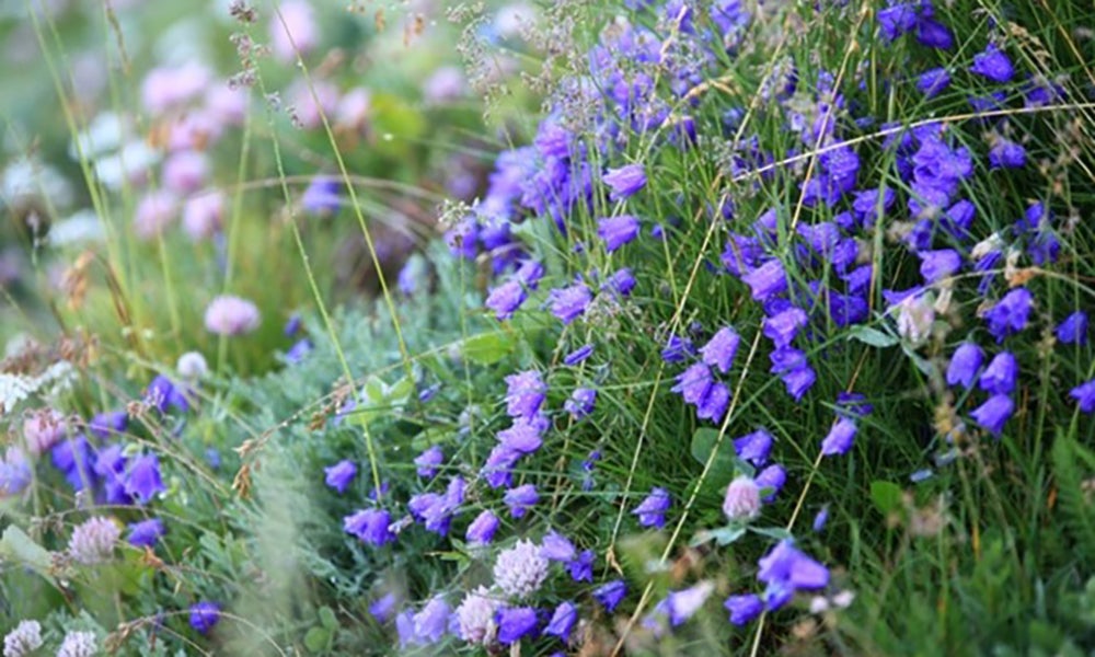 평화로운 돌로미티 초원과 야생화가 함께 하는 새벽