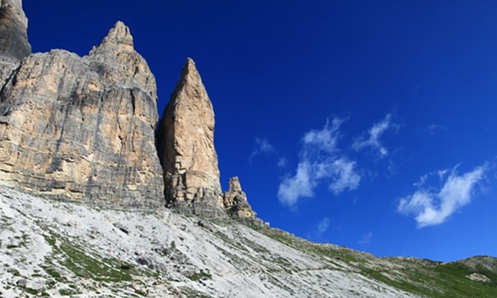 포르첼라 라바레도 (Forcella Lavaredo) 에서 로카텔리 산장으로 가는 101트레일을 걷다 뒤를 돌아보면 트리치메 북벽이 한 눈에 들어온다. 어제 등반을 했던 치마 그란데 길이 선명하게 보인다. 한 번 다녀온 길이라고 한 눈에 알아 본다. 다시 발을 옮겨 로카텔리로 간다. 트레일 끝 오른쪽에 솟은 봉우리, 사소 디 세스토(sasso de sesto)가 보인다. 트레일 우측의 파테르노 산(Monte Paterno,2,744m)은 곳곳에 참호 동굴이 많이 보인다. 파테르노 산은 비아 페라타 루트가 많은 곳이다. 그 말은 산악전쟁이 이곳에서 치열했다는 반증이다.