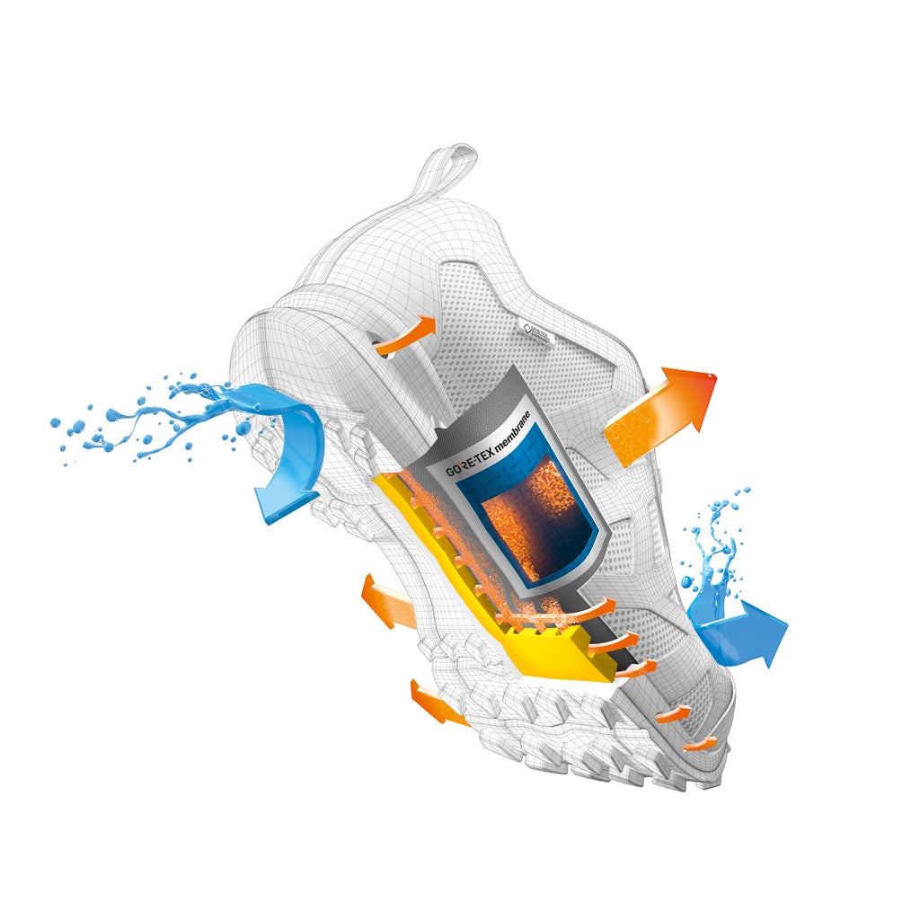 모든 발은 각각 미세기후가 있습니다. 발의 미세기후(micro climate)는 날씨와 운동량에 따라 좌지우지되지만 가장 큰 영향을 받는 것은 신발의 투습 기능입니다. 출퇴근길, 산책길, 여행길, 운동장에서 걷거나 달릴 때 체온은 상승하기 마련입니다. 습기와 땀의 배출을 막을 수 없다는 사실을 알면서도 우리는 발의 상태가 항상 쾌적하기를 바라죠. 새로 나온 러닝화, 스니커즈, 하이킹 부츠의 기능에 우리가 주목하는 이유도 발이 더 쾌적하고 편안하길 원하기 때문입니다. 고어텍스 서라운드 신발은 최상의 온도 관리뿐만 아니라, 뛰어난 방수 기능을 보장합니다. 뛰어난 투습성과 견고한 방수성을 동시에 지닌 고어텍스 서라운드 신발! 어떻게 이토록 완벽하게 작동할까요? 고어텍스 서라운드 신발에는 ‘360도 전방향 투습 기능’이 적용됩니다. 이 기능을 통해 발의 360도 전방향에서 열기와 습기가 외부로 배출되기 때문에 책상에서 하루 종일 일하거나 주말에 등산을 할 때에도 발을 쾌적하고 안전하게 보호할 수 있습니다.